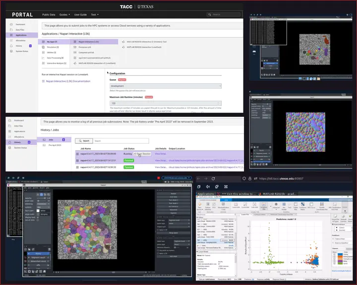 • In the initial stage, a Virtual Network Computing (VNC) or a Desktop Cloud Visualization (DCV) connection are established. This configuration facilitates the setup of a remote desktop connection, capitalizing on the Texas Advanced Computing Center’s (TACC) interactive base docker image as the foundation.