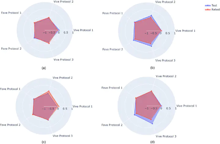 Test-Retest Reliability of VR DevicesBackground: The swinging flashlight test (SFT) is one of the most prominent clinical tests for detecting the relative afferent pupillary defect (RAPD). A positive RAPD localizes the lesion to the affected afferent pupil pathway and is a critical part of any ophthalmic exam. Testing for an RAPD, however, can be challenging (especially when small), and there is significant intrarater and interrater variability. Methods: Prior studies have shown that the pupillometer can improve the detection and measurement of RAPD. In our previous research, we have demonstrated an automatic SFT by utilizing virtual reality (VR), named VR-SFT. We applied our methods to two different brands of VR headsets and achieved comparable results by using a metric, called RAPD score, for differentiating between patients with and without (control) RAPD. We also performed a second VR-SFT on 27 control participants to compare their scores with their first assessments and measure test–retest reliability of VR-SFT. Results: Even in the absence of any RAPD positive data, the intraclass correlation coefficient produces results between 0.44 and 0.83 that are considered of good to moderate reliability. The same results are echoed by the Bland–Altman plots, indicating low bias and high accuracy. The mean of the differences of measurements from test–retest ranges from 0.02 to 0.07 for different protocols and different devices. Conclusions: As variability among various VR devices is an important factor that clinicians should consider, we discuss the test–retest reliability of VR-SFT and the variability among various assessments and between two devices. Translational Relevance: Our study demonstrates the critical necessity of establishing test–retest reliability measures when bridging virtual reality technology into the clinical setting for relevant afferent pupillary defect.